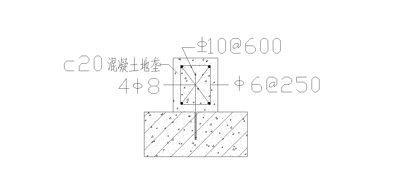 3、混凝土地壟尺寸為寬150*高180,為保證混凝土地壟的穩定,防止地壟開裂,首先沿墻長方向@400打1φ12眼植筋φ10,鋼筋超出結構面100,然后設置主筋φ8箍筋φ6@250鋼筋籠,澆筑C20混凝土。如下圖: