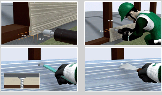 4.從底部開始安裝第一層外墻木掛板(底板),用射釘或3.5厘米長自攻螺釘將外墻木掛板固定在龍骨上;注:如用自攻螺釘應預先用麻花鉆預鉆眼,并將釘頭沉入外墻木掛板平面0.5-1毫米,釘頭位置作防腐處理并用外墻膩子披平;板上釘眼距板上沿不得小于1.2厘米,以統一1.5厘米為佳;距兩頭板端2厘米。
