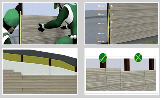 4.同樣的固定方式以搭接法安裝第二塊航力外墻木紋掛板(上下兩塊掛板搭接遮蓋2.5厘米)并以此類推安裝其他掛板。