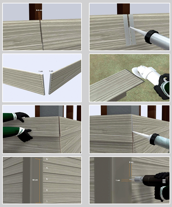 8 .相鄰兩個墻面的交接處(即,陰角和陽角)外墻木掛板需進行收口,常見的處理方法有45度倒角拼縫和利用專用護角條收口兩種方法。陰角只需將相鄰墻面同水平的兩片掛板90度相互垂直固定,在接縫處打膠作密封處理即可。