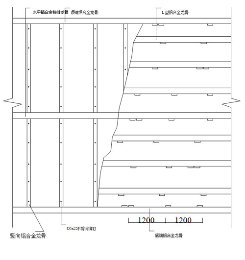 1)在安裝豎向鋁合金龍骨之前,應(yīng)先確定頂端鋁合金龍骨與水平接縫鋁合金龍骨以及水平接縫鋁合金龍骨與底端鋁合金龍骨之間的距離,便于裁切豎向鋁合金龍骨。根據(jù)圖紙上的設(shè)計(jì)在豎向鋁合金龍骨和L型鋁合金龍骨上打眼。