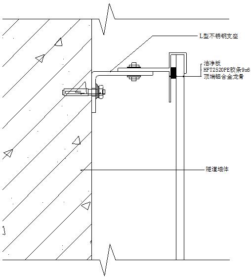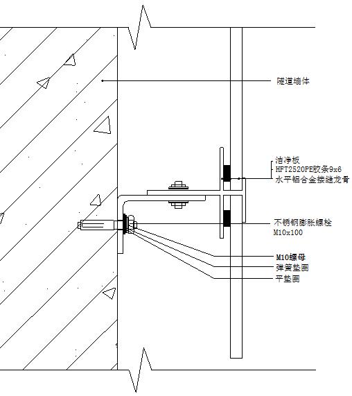 根據(jù)設(shè)計(jì)圖紙,在隧道側(cè)墻壁上彈線,定位;定出各龍骨在支座上的連接點(diǎn)。在定好位置的地方用不銹鋼膨脹螺栓(M10×100)把支座連接在墻上,固定時(shí)應(yīng)保證支座水平。(注意:設(shè)計(jì)圖紙上固定支座的定位,只是一般規(guī)則性的定位,未考慮接縫的誤差,龍骨接縫的誤差以及施工中的誤差,因此在施工中可根據(jù)實(shí)際情況,在作適當(dāng)?shù)恼{(diào)整。)