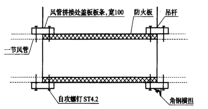 ⑴風(fēng)管的加固可采用不燃管材、扁鋼、防火板板條(寬為200mm)做內(nèi)支撐加固,或用角鋼、U型輕鋼龍骨做外加固。